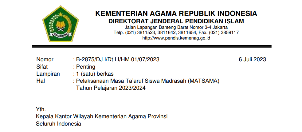 Dengan hormat, diberitahukan bahwa salah satu rangkaian kegiatan dalam Penerimaan Peserta Didik Baru pada Raudhatul Athfal (RA), Madrasah lbtidaiyah (MI), Madrasah Tsanawiyah (MTs), Madrasah Aliyah (MA) dan Madrasah Aliyah Kejuruan (MAK) Tahun Pelajaran 2023/2024 adalah Masa Ta’aruf Siswa Madrasah (MATSAMA) yang meliputi pengenalan kegiatan rutin madrasah, fasilitas madrasah, ciri khas madrasah, nilai, norma dan tata tertib madrasah serta karakter dan budaya yang ada di lingkungan madrasah kepada peserta didik baru.