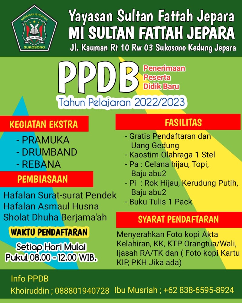 Bapak, Ibu, Saudara yang putra putrinya telah memasuki usia pendidikan dasar, ayo segera daftarkan putra putrinya di MI. Sultan Fattah Sukosono. MI. Sultan Fattah Sukosono membuka pendaftaran peserta didik baru tahun pelajaran 2022/2023 dengan ketentuan sebagai berikut: