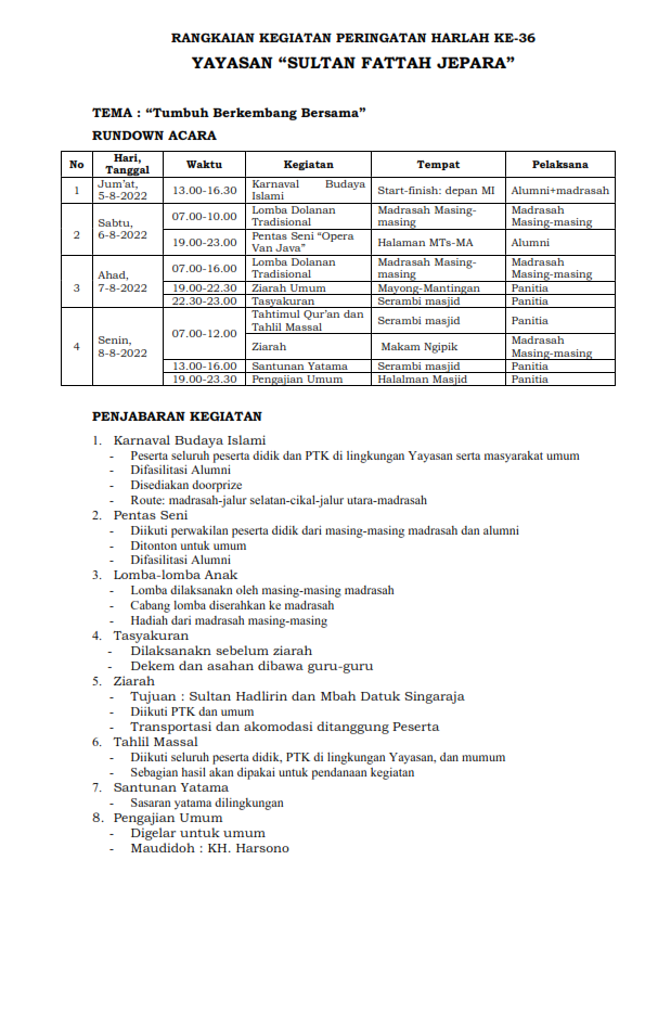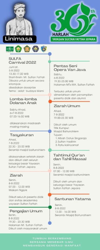 Berikut ini rangkaian acara kegiatan Harlah Yayasan Sultan Fattah Jepara yang tersusun dalam sebuah timeline.